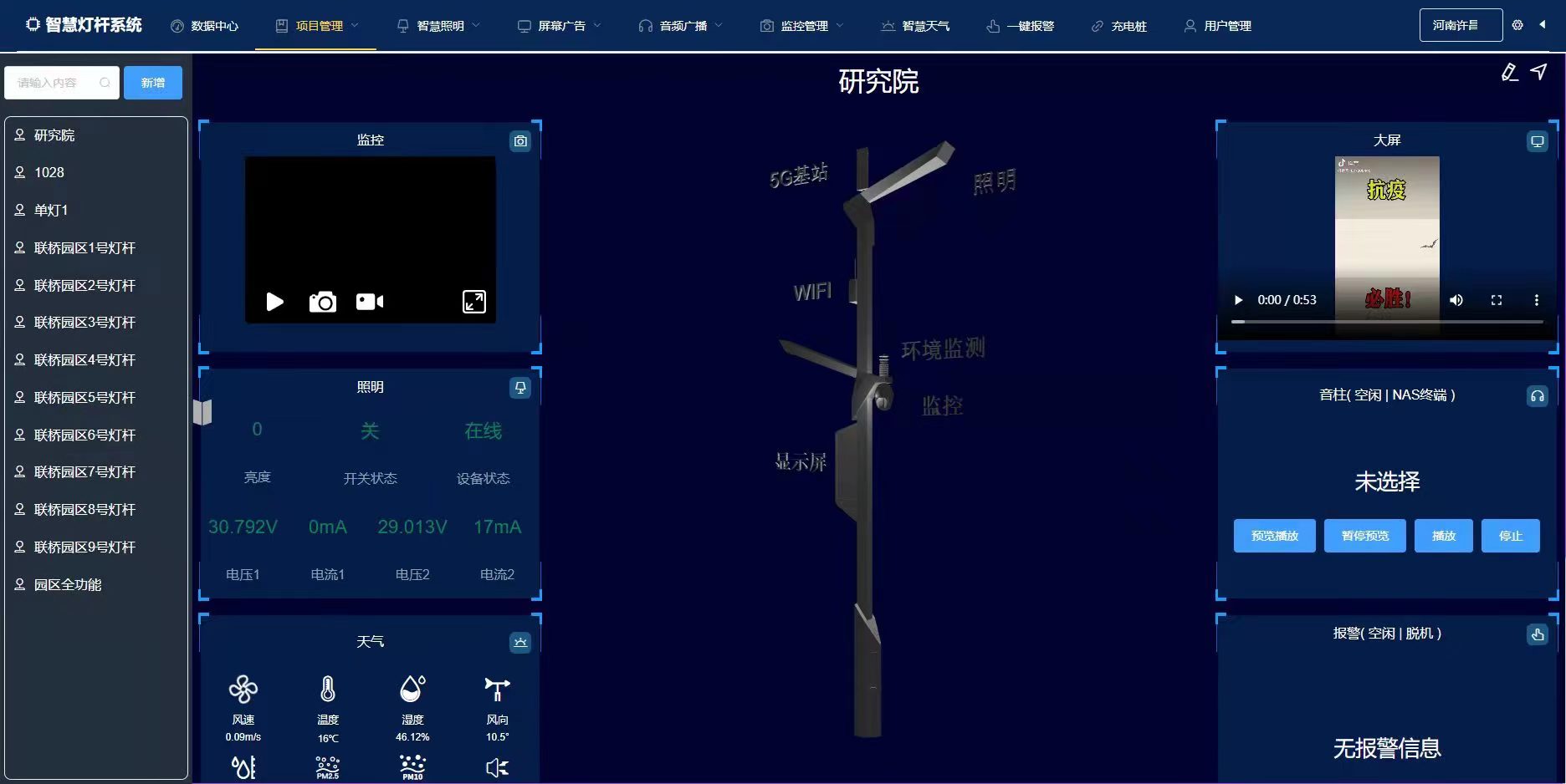 可便捷控制智慧路燈,包括燈光控制、LED屏幕控制、查看監(jiān)控、發(fā)布信息、公共廣播、單燈和燈組開關(guān)控制.
